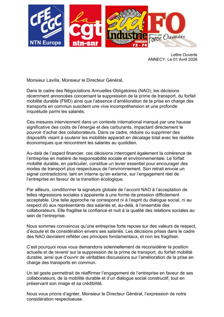 Accueil 2026 NAO Chantage habituel , Lettre Ouverte !! 2026AffichesBrèvesNouveauté NAO Chantage habituel , Lettre Ouverte !! Par CGT NTN SNR - 31 mars 2026 Facebook Twitter Google+ Pinterest WhatsApp lettre-ouverte-Nao-réalisée par la cgt et validée par orga 2026Télécharger ARTICLES CONNEXESPLUS DE L'AUTEUR Classification des emplois, Apld R Temps de travail, Salaire,Prime … ENSEMBLE POUR ÊTRE PLUS FORTS SYNDIQUEZ-VOUS CGT A LIREAll All2016201720182018201820192019201920202020202020212021202120222022202220232023202320242024202520252025202620262026AffichesBrèvesNouveautéTracts Sophie Binet élue secrétaire générale de la CGT CGT NTN SNR - 6 avril 2023 0 La CGT a tenu son 53e congrès du 27 au 31 mars à Clermont Ferrand, dans un... CSE Jeudi 19 Mai 2022 Avis CGT sur rapport égalité Femmes/Hommes 20 mai 2022 Flash info de la réunion sur le temps de travail du... 7 décembre 2020 Brèves du Jeudi 28 Février 2019 21 mars 2019 CATEGORIE POPULAIREAffiches131Brèves31Non classé26202126202024Tracts24202321